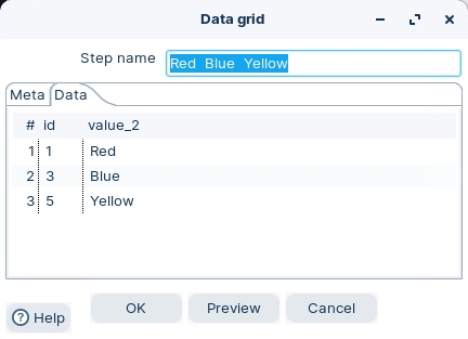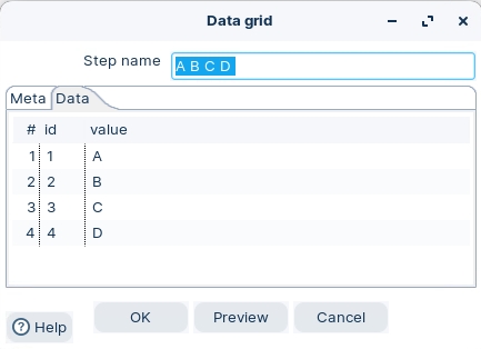 The Data grid step allows you to enter a static list of rows in a grid. This is usually done for testing, reference or demo purposes.