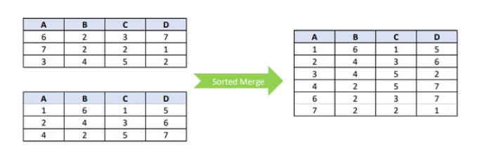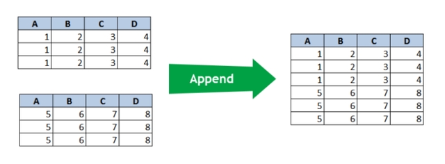 The Append operation simply stacks records from two input streams. All rows from both streams appear in the output without any sorting or matching logic applied.