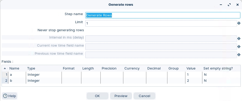 Generate rows outputs a specified number of rows. By default, the rows are empty; however, they can contain several static fields. This step is used primarily for testing purposes. It may be useful for generating a fixed number of rows, for example, you want exactly 12 rows for 12 months.