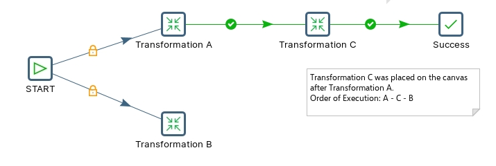 Even though Transformation C and Success were placed on the Canvas after Transformation B .. they will be executed before Transformation B as there's a hop from Transformation A.