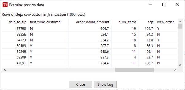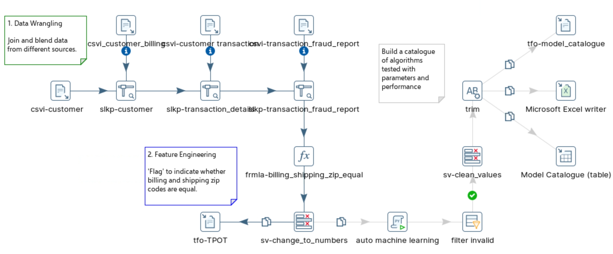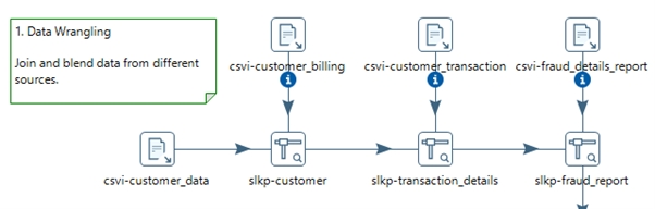 To begin with, customer data is joined from several data sources, and then blended with transactional data and historical fraud occurrences contained in a CSV file.