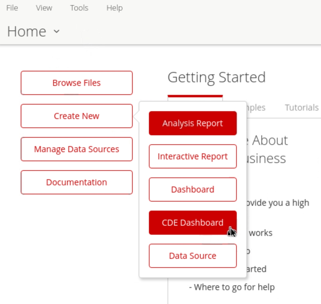 From the menu that displays, select the New CDE Dashboard option. You can now begin creating your first CDE dashboard.