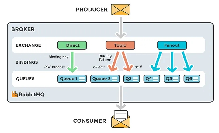 Messages are not published directly to a queue; instead, the producer sends messages to an exchange. An exchange is responsible for routing the messages to different queues with the help of bindings and routing keys.