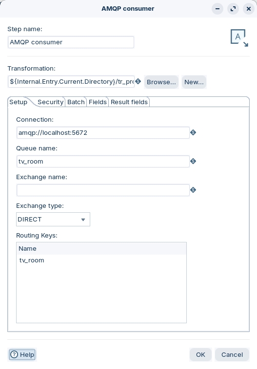 Similiar to HiveMQ, lets subscribe to the tv_room topic retained in RabbitMQ and use Pentaho Data Integration to process the data.