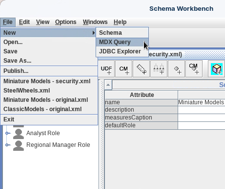 Para acceder al modo Consulta MDX, en el menú selecciona Archivo > Nuevo > Consulta MDX.