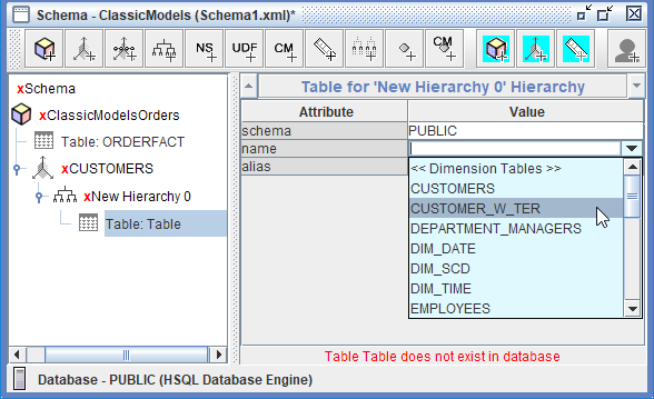 Haz clic en el Valor para name, selecciona PUBLIC > CUSTOMER_W_TER y presiona Tab.