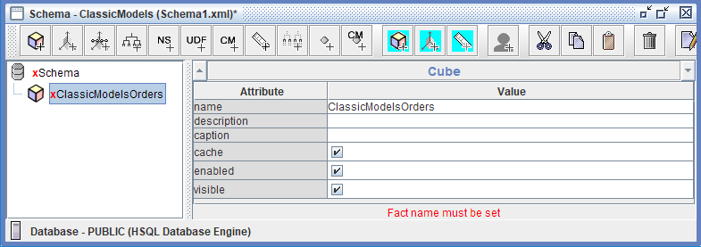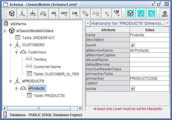 En la terminología de Mondrian, un cubo representa un proceso empresarial o área temática específica—en este caso, transacciones de pedidos—y actúa como la estructura central que conecta la ORDERFACT tabla de hechos con sus dimensiones asociadas (CUSTOMERS y PRODUCTS) y medidas (Sales). El cubo define los límites analíticos y las posibilidades para los usuarios, determinando qué preguntas se pueden responder y qué combinaciones de datos se pueden explorar.