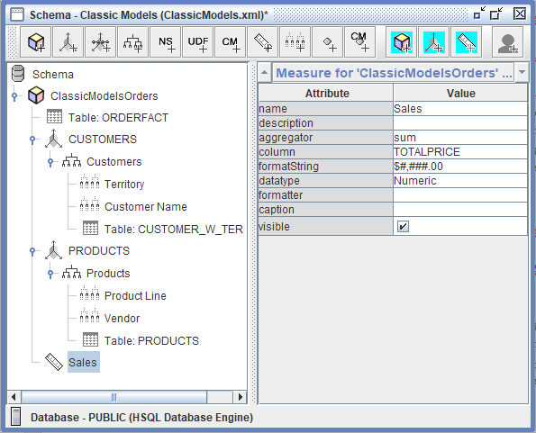 Las medidas en el cubo ClassicModelsOrders son los hechos cuantitativos y numéricos que los usuarios de negocio analizan y agregan a través de diferentes perspectivas dimensionales. La medida principal en este esquema es Sales, que representa el ingreso total de las transacciones de pedidos y se define mapeando a la TOTALPRICE columna en la tabla de hechos ORDERFACT. Esta medida usa el sum agregador, lo que significa que los valores de ventas se suman cuando se agregan a través de cualquier dimensión—ya sea viendo ventas totales por Territory, Product Line o cualquier combinación de dimensiones.