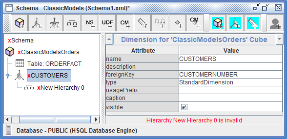 El ClassicModelsOrders el cubo contiene dos dimensiones estándar que permiten el análisis multidimensional de los datos de ventas. La CUSTOMERS dimensión, vinculada a la tabla de hechos a través de la clave externa CUSTOMERNUMBER, proporciona una perspectiva analítica centrada en el cliente a través de la jerarquía "Customers", que incluye dos niveles: