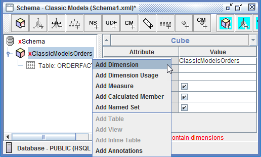 Para agregar una dimensión, en el panel izquierdo, haz clic derecho en ClassicModelsOrders Cube y haz clic en Agregar Dimensión.