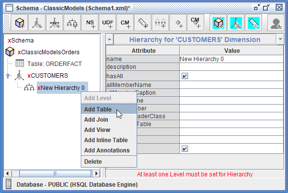Para agregar un nivel, en el panel izquierdo, haz clic derecho en la Jerarquía de Cliente y selecciona Agregar Nivel.