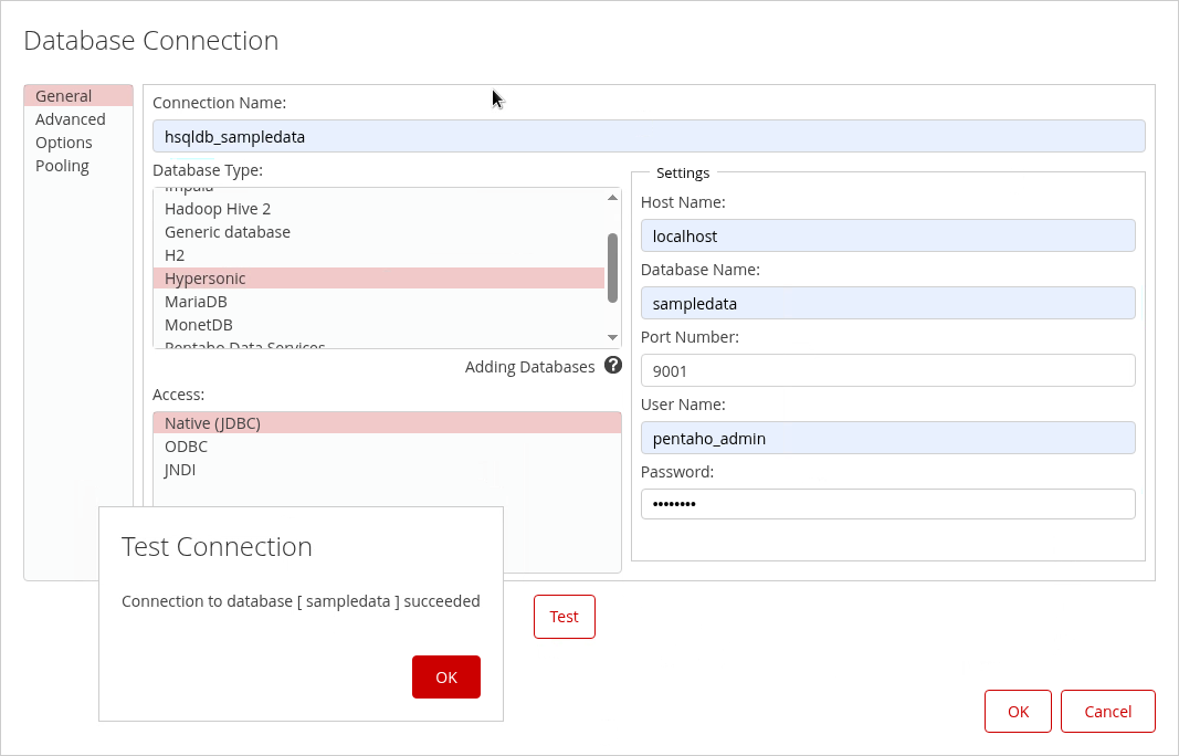El flujo de trabajo anterior crea y define una JDBC del lado del cliente, es decir, permite que Schema Workbench se conecte a la Fuente de Datos Hypersonic. Cuando publiques el esquema en el Repositorio de Pentaho, debes asegurarte de que la misma conexión también esté definida - Administrar Fuentes de Datos.