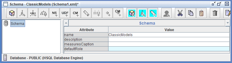 Para crear un nuevo esquema, en el menú elige Archivo > Nuevo > Esquema. Alternativamente, desde la barra de herramientas, haz clic en el botón Nuevo y luego en Esquema.