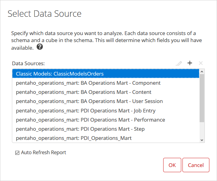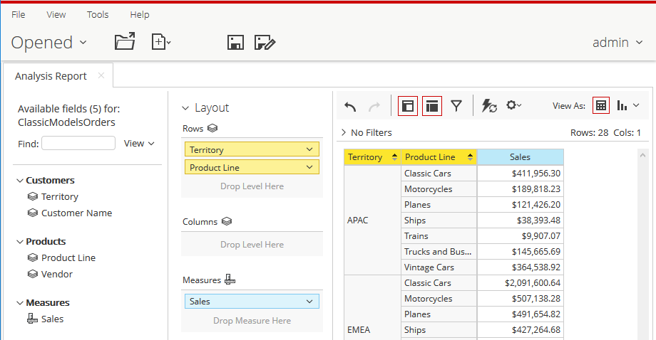 Al publicarse en el Pentaho BA Server, el cubo ClassicModelsOrders queda disponible como fuente de datos en Analyzer, permitiendo a los usuarios de negocio segmentar, desglosar, profundizar y pivotar interactivamente los datos de ventas a través de territorios de clientes y líneas de producto para obtener conocimientos y tomar decisiones basadas en datos. Esencialmente, el cubo transforma una estructura de base de datos relacional plana en un modelo multidimensional optimizado para consultas analíticas rápidas e intuitivas y exploración.