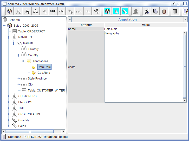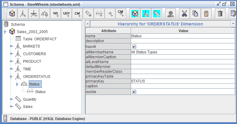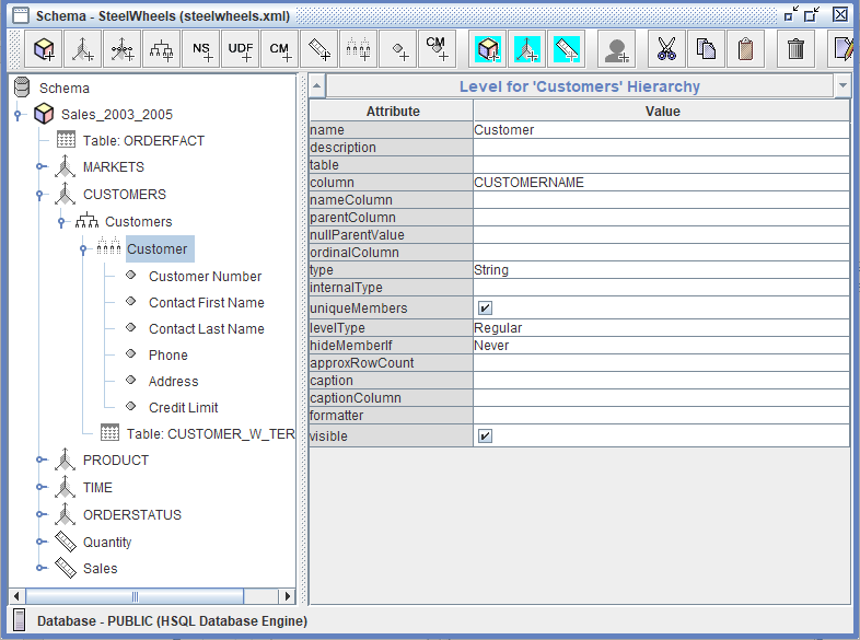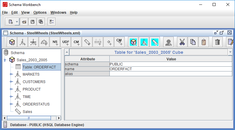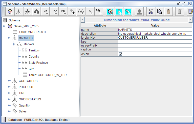 El SteelWheels esquema es un esquema de análisis Mondrian completo construido sobre la base de datos SampleData que demuestra el modelado dimensional a nivel empresarial para análisis de ventas. El esquema se centra en el cubo Sales_2003_2005 que usa la tabla de hechos ORDERFACT que contiene datos transaccionales de ventas que abarcan tres años.