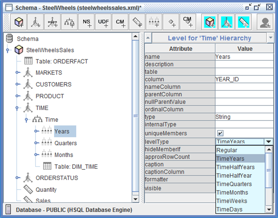 Las dimensiones de tiempo se identifican con type=TimeDimension. El papel de un nivel en una dimensión de tiempo se indica con el atributo levelType: