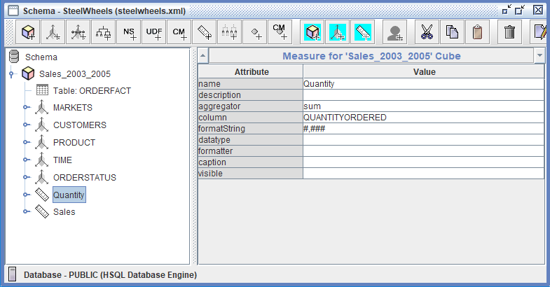 El esquema incluye múltiples medidas tales como Quantity y Sales con agregadores adecuados y cadenas de formato, lo que lo convierte en un modelo de referencia ideal para entender cómo los complejos requisitos de negocio se traducen en cubos OLAP funcionales que soportan informes y análisis interactivos en Pentaho Analyzer.