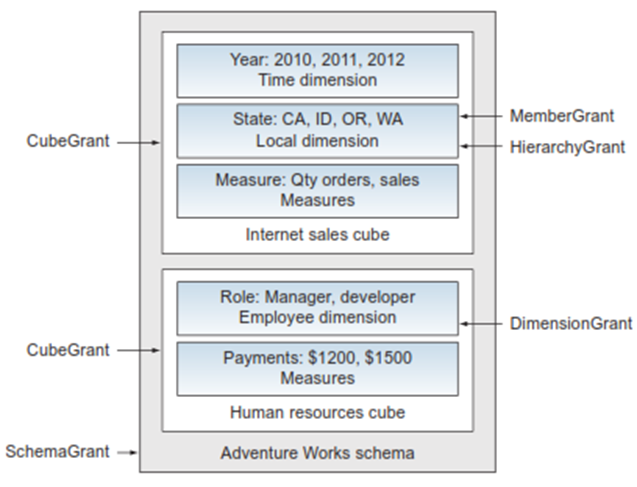 Da al rol acceso a todos los cubos y dimensiones en el esquema, pero más adelante puede limitar el acceso a la totalidad o partes de los datos usando concesiones más detalladas. Otras concesiones se anidan dentro del schema grant.